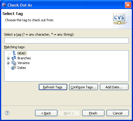 This wizard helps you check out one or more projects from a CVS repository. It is available from the Import menu, the New > Project menu and the toolbar of the CVS Repository Exploring perspective. It is also opened when performing a Checkout As from the CVS Repositories view.